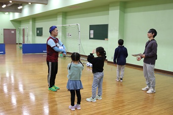 カラーコーンの間を曲線で操作する練習や、ドリブルからシュートまでの一連の動きを体験していただきました。最後にはミニゴールを使用した試合形式も行い、白熱したプレーを楽しんでいただきました。