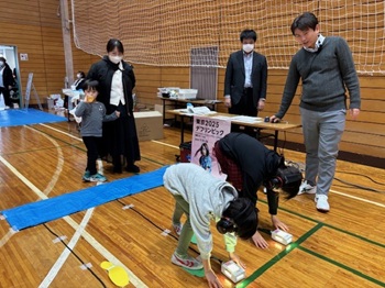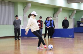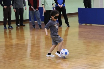 アイマスクを着用して目が見えない状態に慣れるコミュニケーション体験を行った後、音が鳴るブラインドサッカー用ボールを使用し、感覚を研ぎ澄ませながらプレーするサッカーの楽しさを体験していただきました。