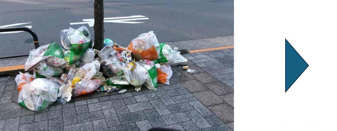 この「飲食店等から排出されたごみ袋」の一部において、回収されるまでに数時間~数日放置(不適正な排出)されてしまい、そのごみ袋の周りに来街された方がごみを捨ててしまう「ごみ袋がごみを呼ぶ」と思われる状況が見受けられました(昨年もこうした状況が見受けられたため、上記対策のとおり周辺の飲食店等に呼びかけを行ったところです)。